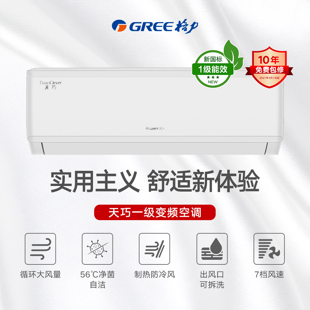 运动子母导风板,凉感新体验;出风口可拆洗设计,轻松拆洗更洁净;56℃净菌自洁,强力除尘,高温杀菌;格力AI节能,节能新时代